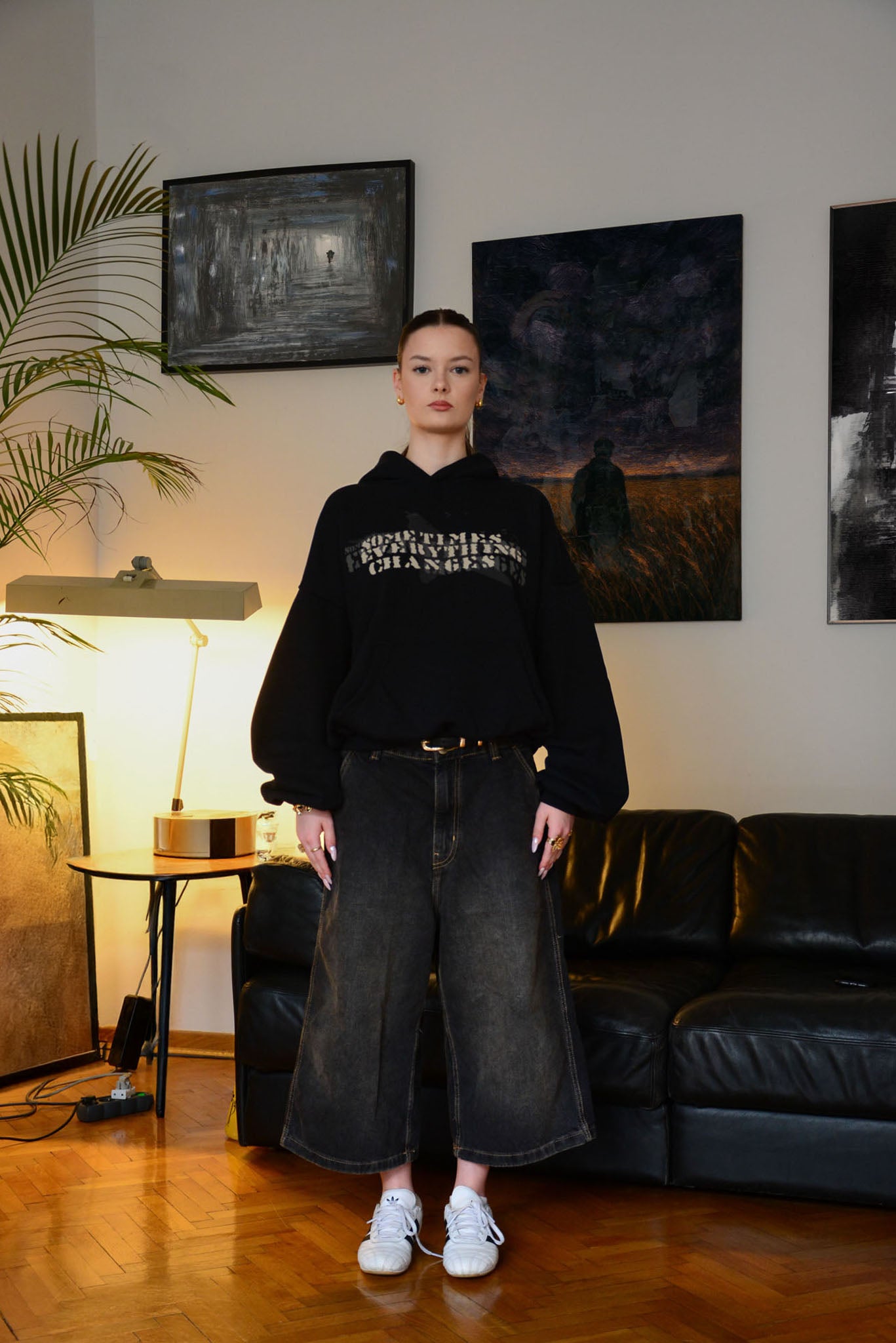 Czarna bluza baggy wykonana z wysokiej jakości 100% bawełny o gramaturze 400g – gruba, solidna i trwała. Luźny krój baggy fit świetnie układa się na sylwetce. Nadruk wykonany sitodrukiem – bardzo trwały, nie spiera się, nie pęka i jest niewyczuwalny pod palcami.